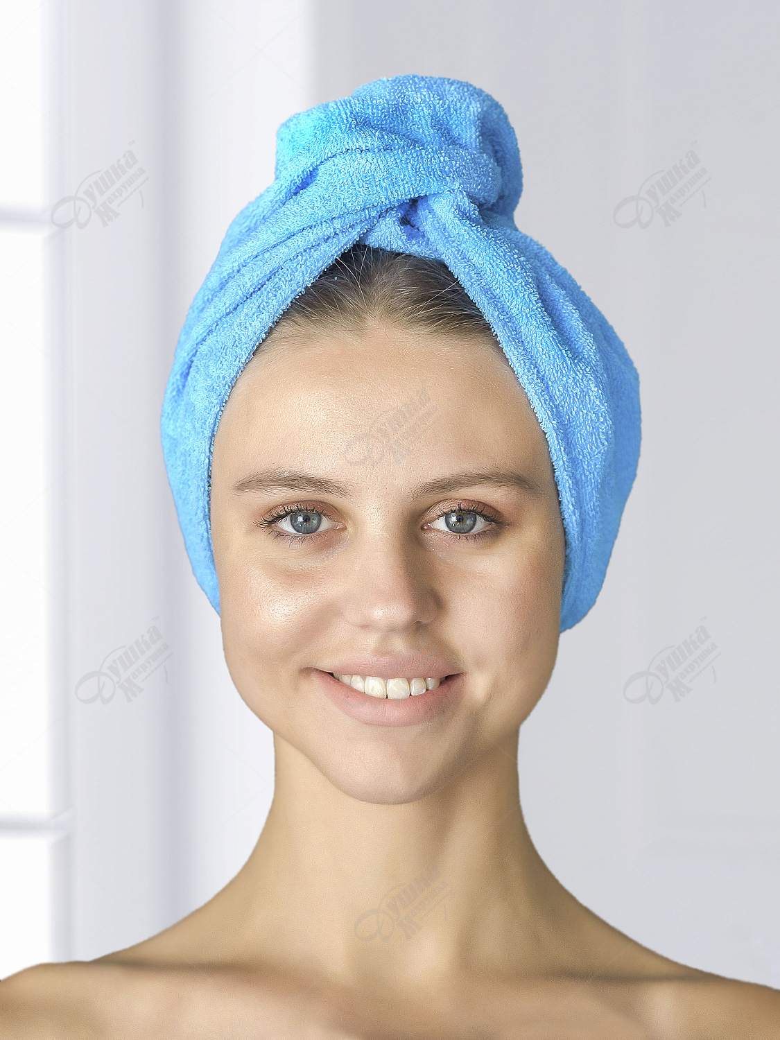 Красивая голубая махровая чалма на пуговице – незаменимый женский аксессуар для бани и сауны.