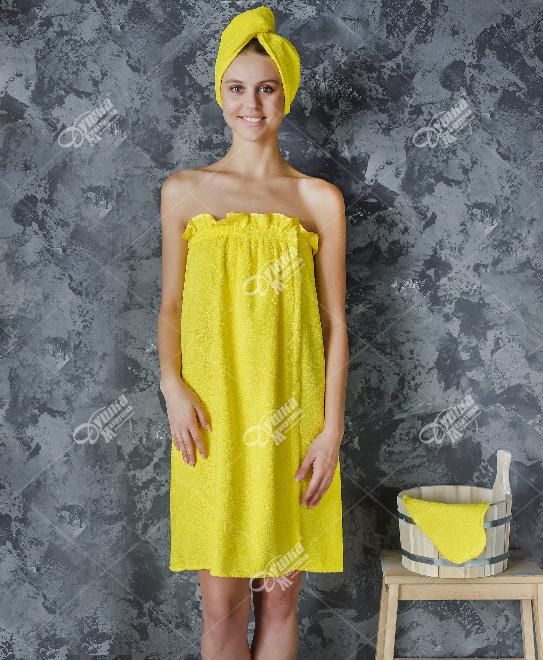 Желтый женский набор для бани и сауны – это комплект красивых и удобных аксессуаров, изготовленных из мягкой махровой ткани. Они помогут вам в полной мере расслабиться и насладиться отдыхом, при этом оставаясь очаровательной и нарядной. В комплект входят: