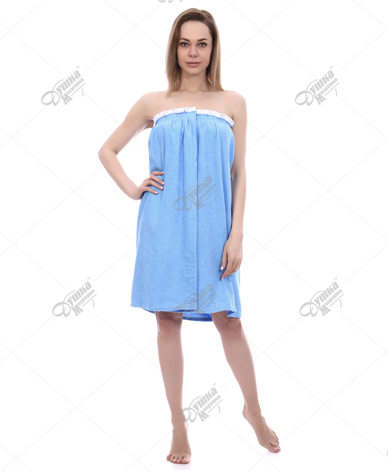 Голубое махровое парео для бани – это удобная и стильная альтернатива полотенцу или простыне. Оно позволяет быстро обернуть тело мягкой тканью с нежным ворсом и надежно зафиксировать ее липучкой. Модель изготовлена из 100% хлопка. Парео очень качественное: оно отлично впитывает влагу, не линяет при стирке в горячей воде, долговечно. Волнообразный верхний край, украшенный декоративным кантом, придает модели нарядный, женственный и кокетливый вид. Теги: Для бани, Парео
