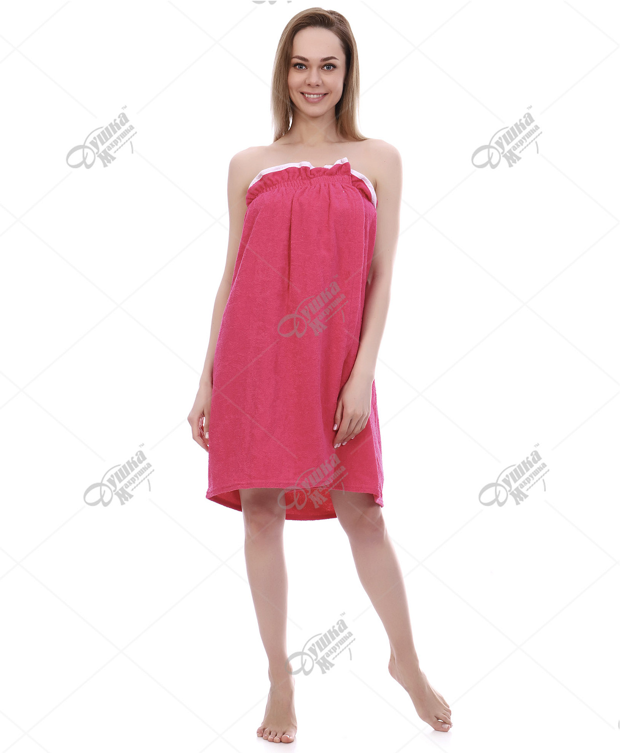 Малиновое махровое парео для бани – это удобная и стильная альтернатива полотенцу или простыне. Оно позволяет быстро обернуть тело мягкой тканью с нежным ворсом и надежно зафиксировать ее липучкой. Модель изготовлена из 100% хлопка. Парео очень качественное: оно отлично впитывает влагу, не линяет при стирке в горячей воде, долговечно. Волнообразный верхний край, украшенный декоративным кантом, придает модели нарядный, женственный и кокетливый вид. Теги: Для бани, Парео