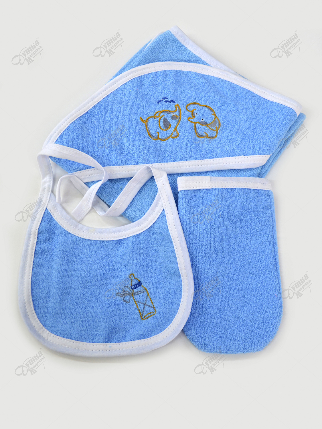 Набор для купания голубой с вышивкой "Слонята". Прекрасный банный комплект с вышивкой создан из 100% натурального хлопка. Мягкая махра быстро впитает излишние капельки воды, оставшиеся после купания. В набор (комплект) входит: