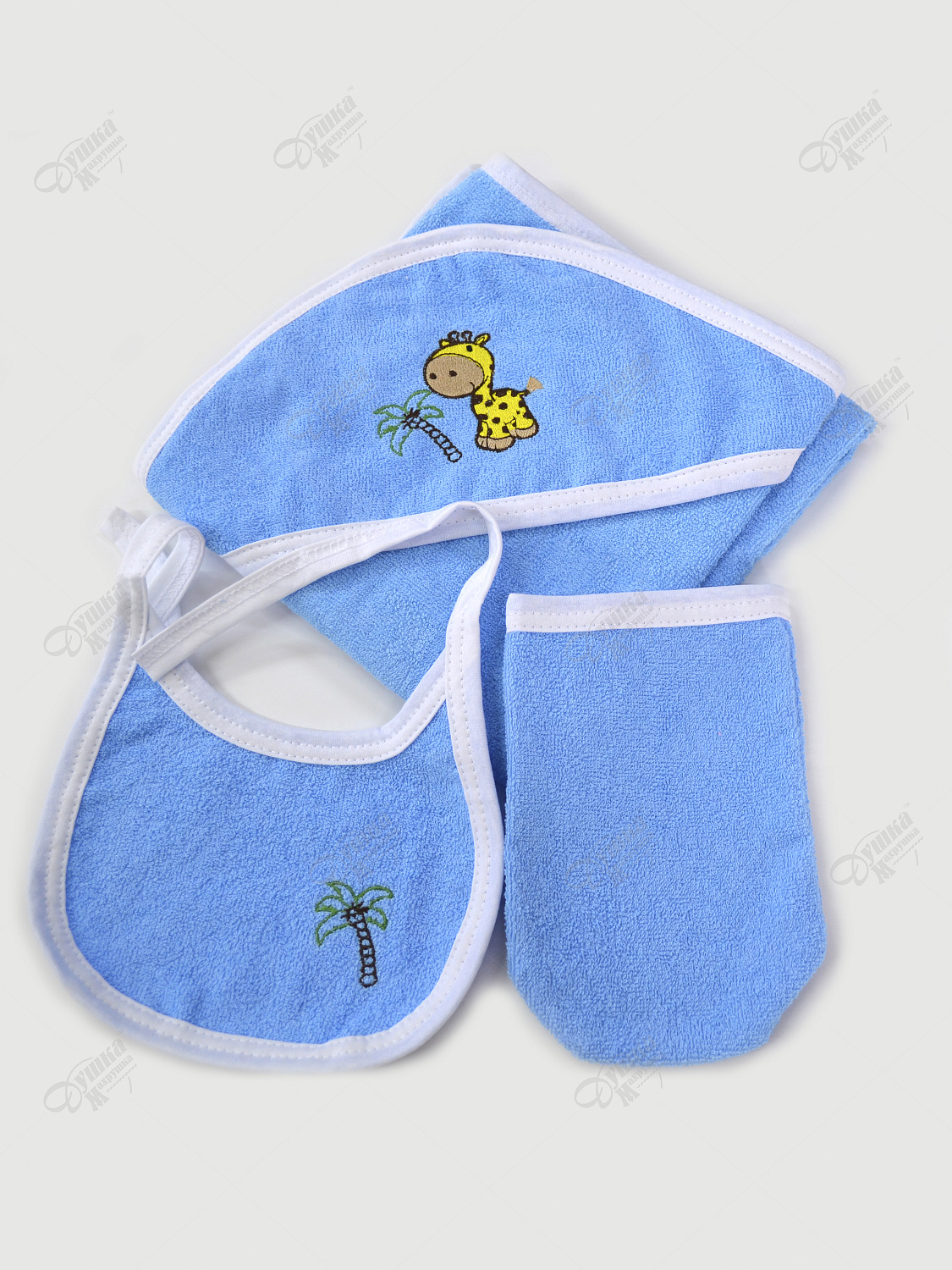 Набор для купания голубой с вышивкой "Жирафик" Прекрасный банный комплект с вышивкой создан из 100% натурального хлопка. Мягкая махра быстро впитает излишние капельки воды, оставшиеся после купания. В набор (комплект) входит: