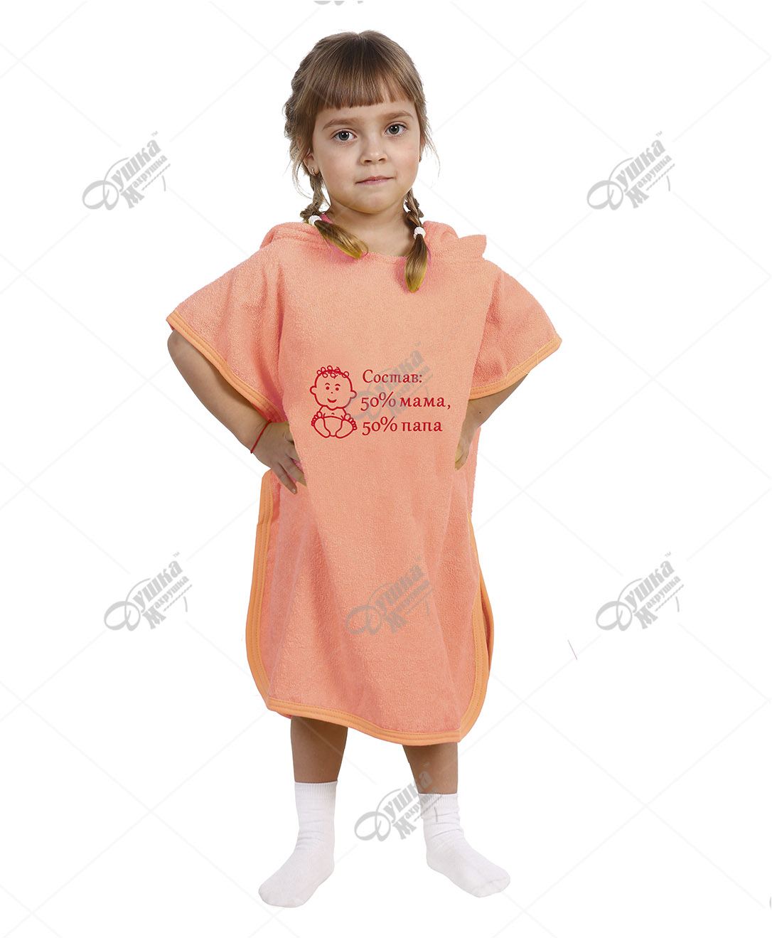 Махровое детское персиковое пончо с вышивкой «Состав 50 на 50» изготовлено из 100% натурального хлопка, выращенного в экологически чистых регионах. Плотность ткани в изделии – 300 г/м. Модель украшена качественной декоративной вышивкой. Края обшиты плотной тесьмой, предохраняющей их от истрепывания. Пончо удобно для ребенка, хорошо впитывает влагу и быстро просыхает. При стирке не линяет, не деформируется, износостойкое. Отличный вариант для бани, бассейна и пляжного отдыха. Обращаем внимание, что на данную категорию выпускаемой продукции даем гарантию только на изделие и вышивку. Цвета самого пончо и ниток могут меняться, идут в ассортименте. Теги: Для детей, Пончо