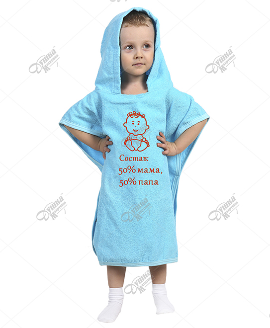 Махровое детское пончо «Состав 50 на 50» изготовлено из 100% натурального хлопка, выращенного в экологически чистых регионах. Плотность ткани в изделии – 300 г/м. Модель украшена качественной декоративной вышивкой. Края обшиты плотной тесьмой, предохраняющей их от истрепывания.