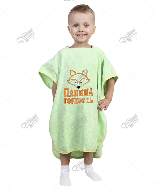 Махровое детское пончо «Папина гордость» изготовлено из 100% натурального хлопка, выращенного в экологически чистых регионах. Плотность ткани в изделии – 300 г/м. Модель украшена качественной декоративной вышивкой. Края обшиты плотной тесьмой, предохраняющей их от истрепывания.
