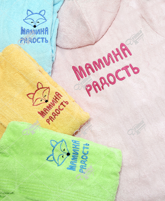 Именной халат детский с вышивкой на спине "Мамин хвостик" и мордочкой Лисенка выполнен из высококачественного 100% хлопка. Вышивка на махровом халате сделает его особенным, неповторимым. Стиль шрифта надписи и мордочки будет как на фотографии. Расположение вышивки на спине. Можно заменить надпись "Мамин хвостик" на "Мамину радость", мордочка Лисенка не изменяется. Цвет нити вышивки и халата может быть любым на ваше усмотрение.<br />