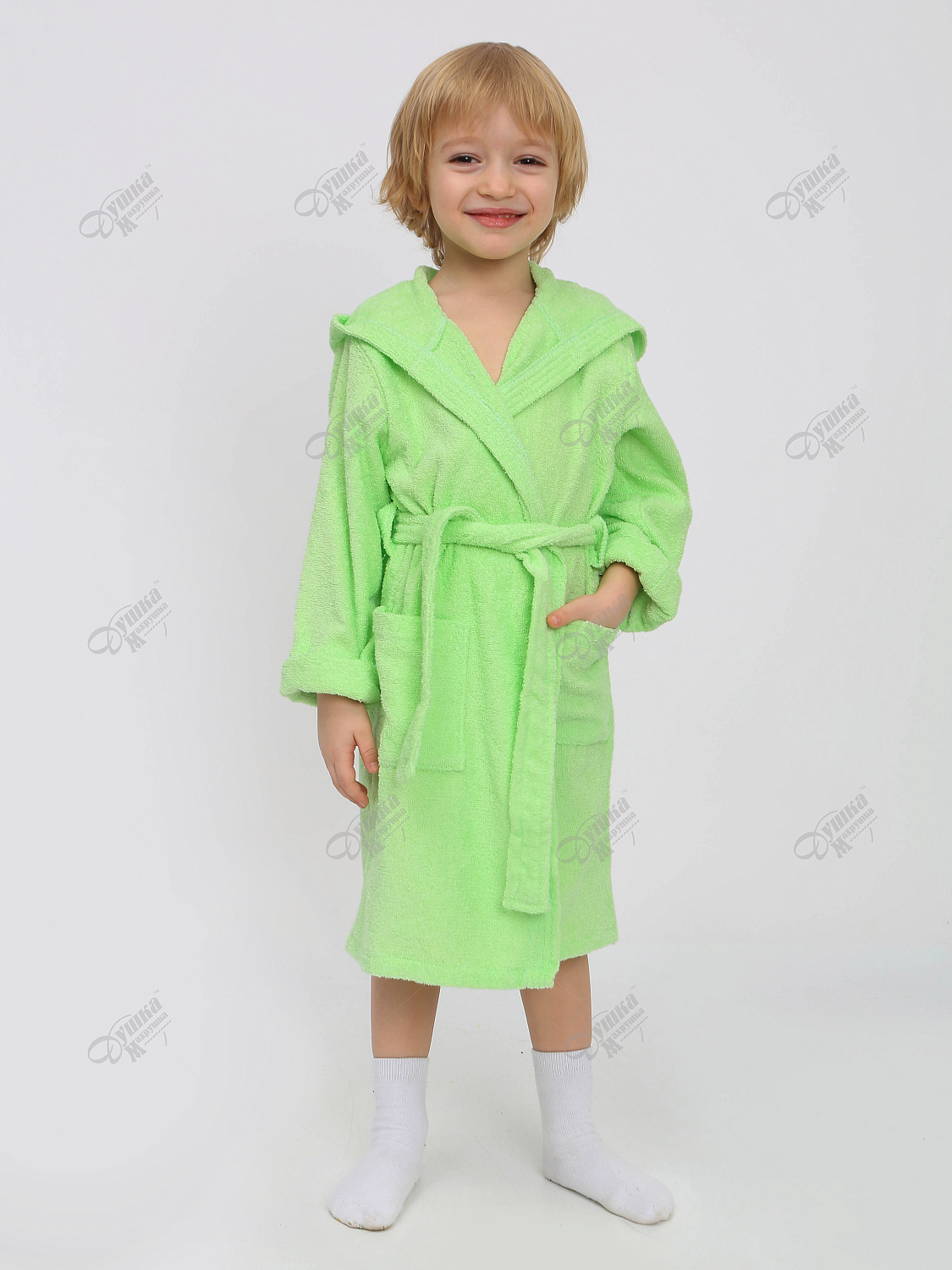 Удобный салатовый детский махровый халат с капюшоном изготовлен из высококачественного 100% хлопка.