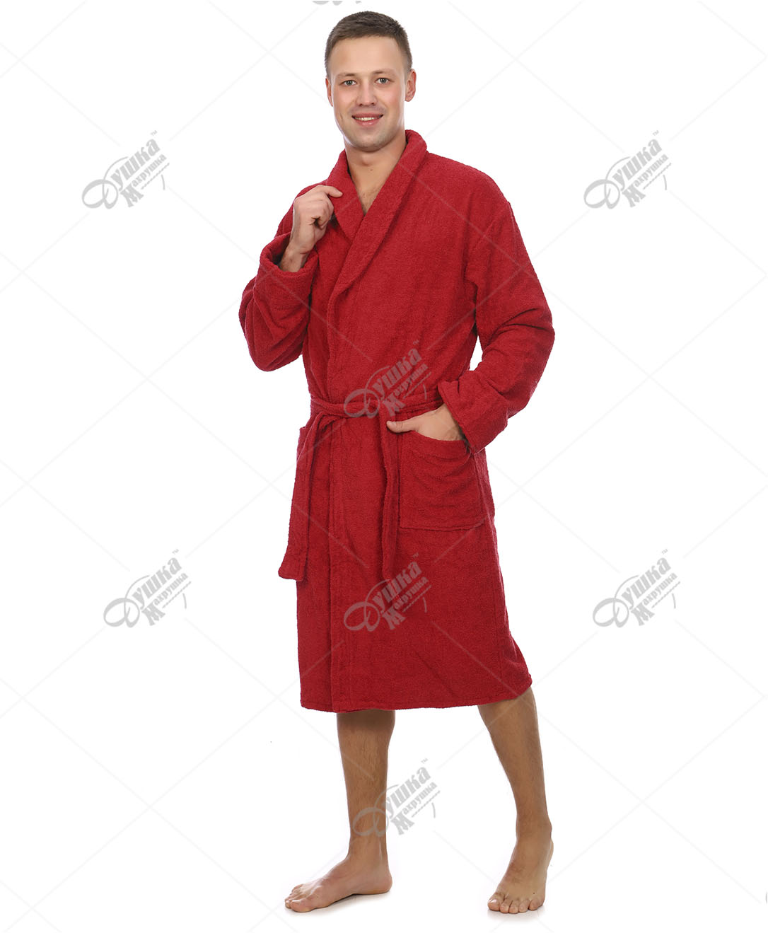 Удобный бордовый мужской халат с воротником «шалька» изготовлен из 100% хлопка. Плотность – 400 г/м². Мягкая махровая ткань хорошо впитывает влагу, гигроскопична, не линяет, отлично переносит многочисленные стирки. Шалька придает изделию солидный и респектабельный вид. Вместо пуговиц предусмотрен широкий пояс – это позволяет быстро и плотно запахнуть халат на теле. Отличный вариант для бань, саун, гостиничных комплексов, а также в качестве повседневной домашней одежды после водных процедур.