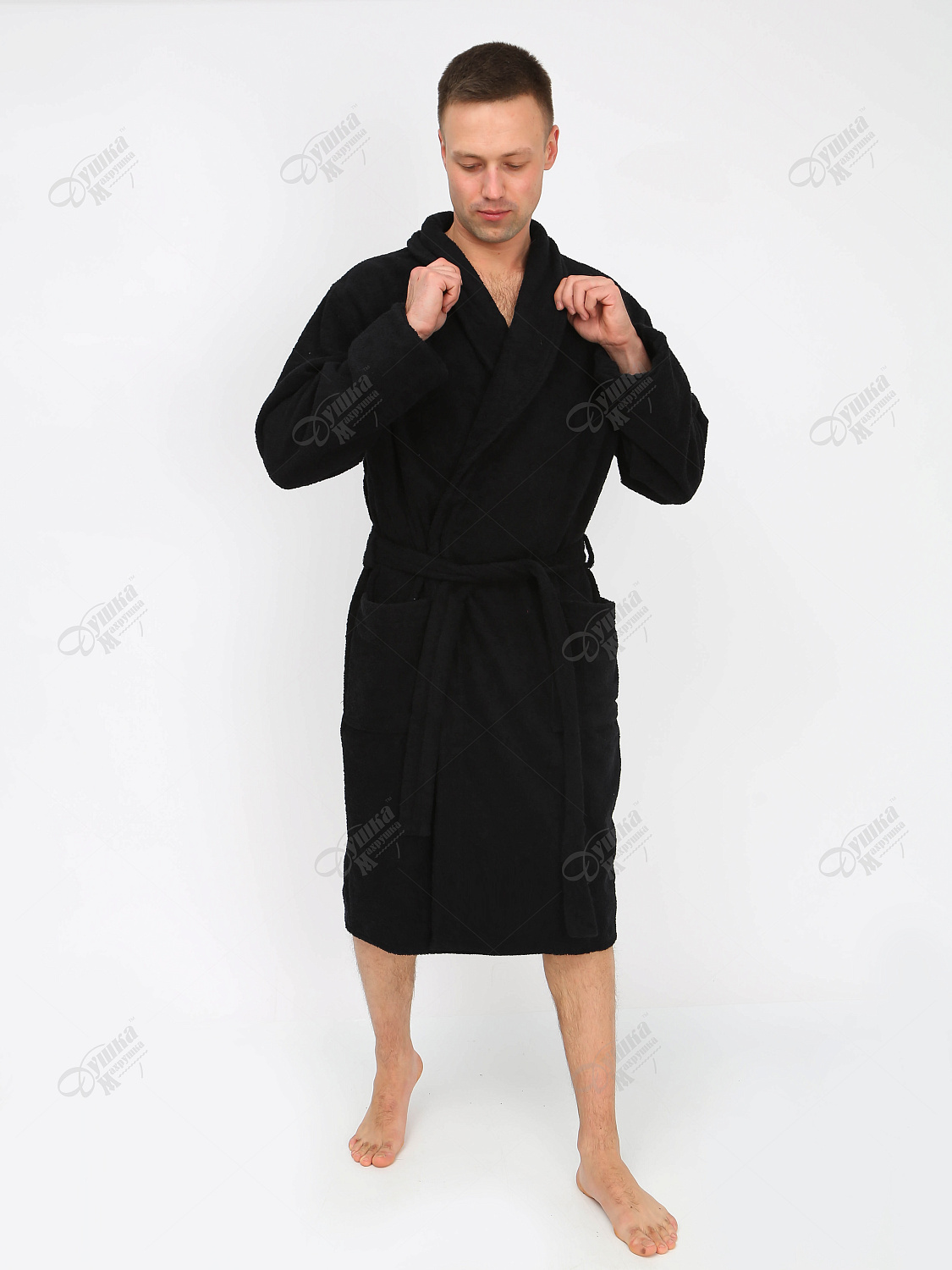 Удобный черный мужской халат с воротником «шалька» изготовлен из 100% хлопка.