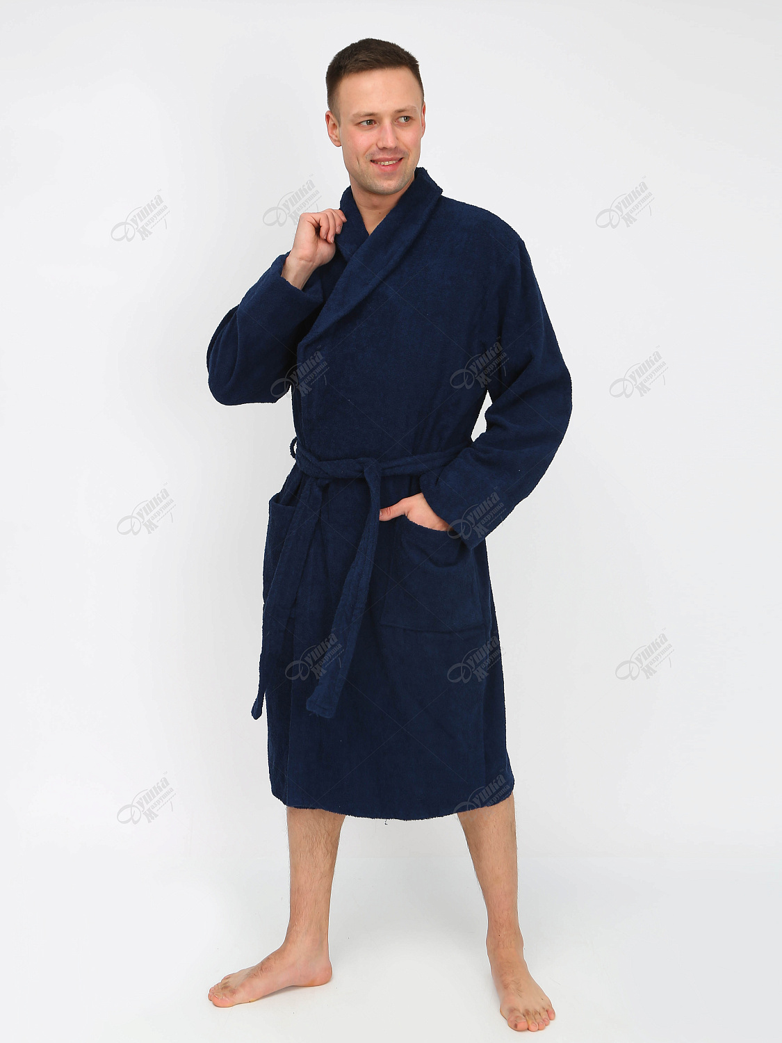 Удобный синий мужской халат с воротником «шалька» изготовлен из 100% хлопка. Плотность –400 г/м². Мягкая махровая ткань хорошо впитывает влагу, гигроскопична, не линяет, отлично переносит многочисленные стирки. Шалька придает изделию солидный и респектабельный вид. Вместо пуговиц предусмотрен широкий пояс – это позволяет быстро и плотно запахнуть халат на теле. Отличный вариант для бань, саун, гостиничных комплексов, а также в качестве повседневной домашней одежды после водных процедур. Наличие по размерам и цветам уточняйте у менеджера при каждом заказе. Теги: Халаты, Махровые халаты, Мужские