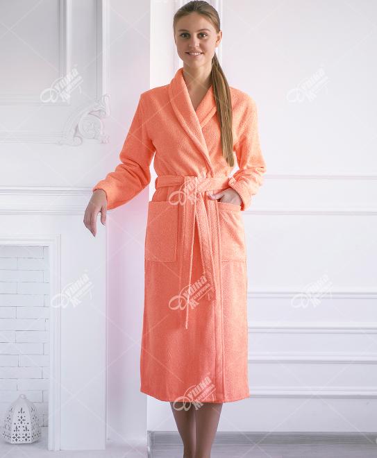 Женский коралловый махровый халат с воротником шалькой изготовлен из 100% хлопка, выращенного в экологически чистых регионах. Плотность – 400 г/м². Мягкая ткань приятна на ощупь, а широкий пояс позволяет плотно запахнуть халат, не причиняя коже дискомфорта.