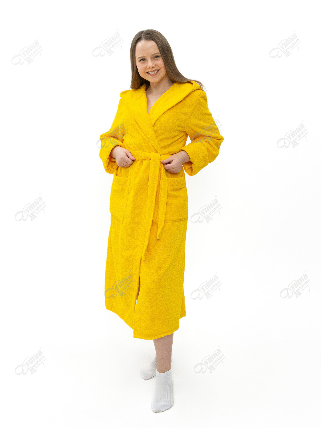Женский желтый махровый удлиненный с капюшоном халат изготовлен из 100% хлопка, выращенного в экологически чистых регионах. Плотность – 400 г/м². Мягкая ткань приятна на ощупь, а широкий пояс позволяет плотно запахнуть халат, не причиняя коже дискомфорта. Изделие не линяет, не садится после стирки, прочное и износостойкое. Это оптимальный вариант комфортной и красивой одежды для бани, сауны, СПА-салона, дома (после приема душа).