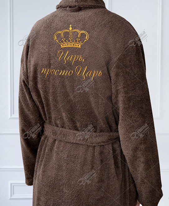 Возможно нанесение вышивки любого цвета по желанию заказчика и выбор желаемого цвета халата. Стиль шрифта "Царь, просто Царь" и короны будет как на фотографии. Собственная студия машинной вышивки сделает любой халат эксклюзивным и единственным. Машинная вышивка нитками долговечна и не теряет яркость после многочисленных стирок. Теги: Халаты, Именные