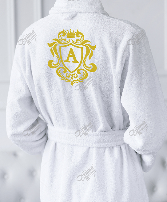Махровый халат с вышивкой «Фамильный герб» на спине из 100% хлопка. Вышивка контура герба остается неизменной, внутри меняются только инициалы. Стоит указать необходимые инициалы, определиться с цветом изделия и сделать заказ. Стиль шрифта инициалов будет как на фотографии. Собственная студия машинной вышивки сделает любой халат эксклюзивным и единственным.