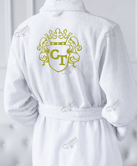 Махровый халат с вышивкой «Фамильный герб» на спине из 100% хлопка. Вышивка контура герба остается неизменной, внутри меняются только инициалы. Стоит указать необходимые инициалы, определиться с цветом изделия и сделать заказ. Собственная студия машинной вышивки сделает любой халат эксклюзивным и единственным.