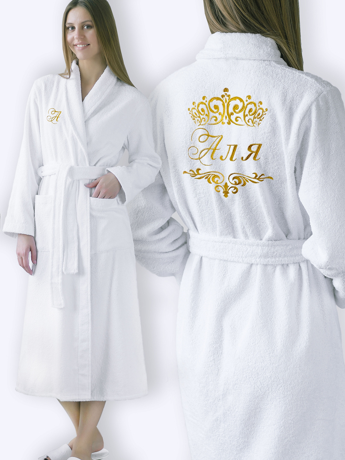Махровый халат с вышивкой «Именной» на спине из 100% хлопка. Вышивка контура герба остается неизменной, внутри меняются только имя. Стоит указать необходимое имя, определиться с цветом изделия и сделать заказ. Собственная студия машинной вышивки сделает любой халат эксклюзивным и единственным.
