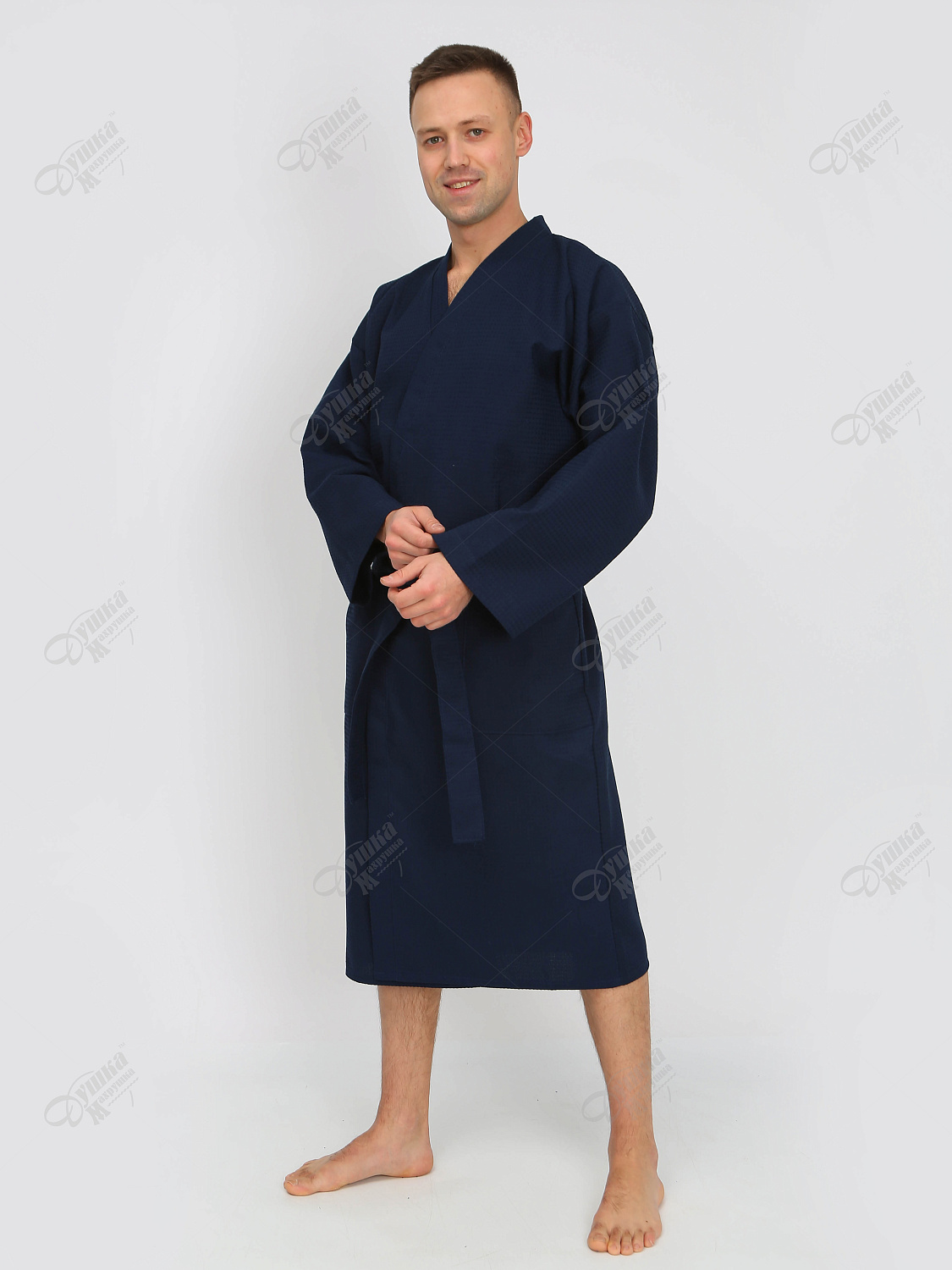 Вафельный синий мужской халат-кимоно из 100% хлопковой ткани выполнен в лаконичном восточном стиле. Изделие легкое, но достаточно плотное (240 г/м²). Строгий дизайн удачно сочетается с рифленой фактурой ткани, благодаря чему халат приобретает характерный вид повседневного мужского кимоно периода Эдо. Модель практична, не линяет даже после многочисленных стирок. Отлично подойдет для бани, сауны или как домашний вариант повседневной одежды. Наличие по размерам и цветам уточняйте у менеджера при каждом заказе. Теги: Халаты, Вафельные халаты, Мужские