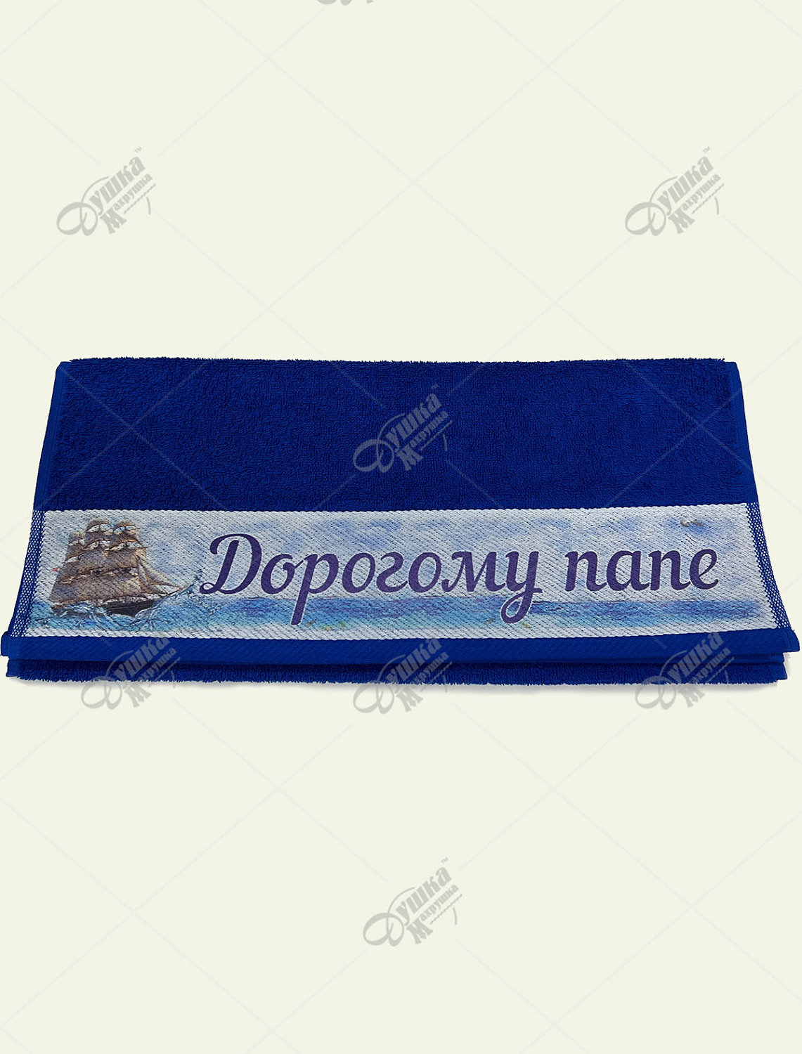 Махровое полотенце синее с надписью в бордюре "Дорогому папе" из 100% хлопка. Полотенца с печатью хорошо стираются, устойчивы к износу и долго сохраняют приятную мягкость. Наличие по цветам уточняйте у менеджера при каждом заказе. Теги: Полотенца, С надписью