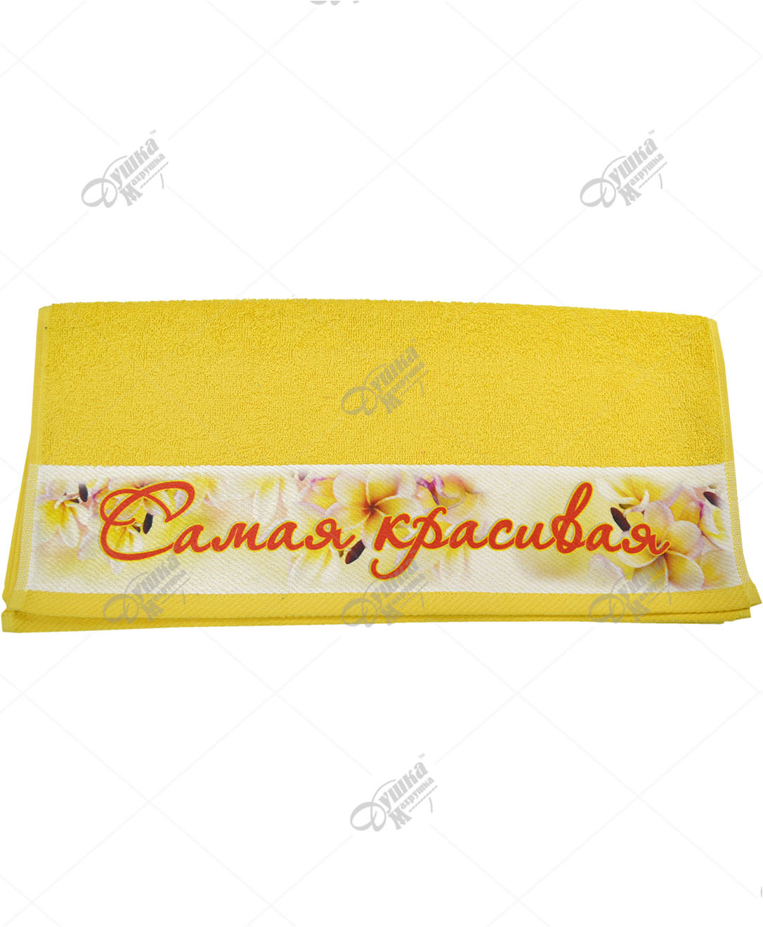 Махровое полотенце желтое с надписью в бордюре "Самая красивая" из 100% хлопка. Полотенца с печатью хорошо стираются, устойчивы к износу и долго сохраняют приятную мягкость. Наличие по цветам уточняйте у менеджера при каждом заказе. Теги: Полотенца, С надписью