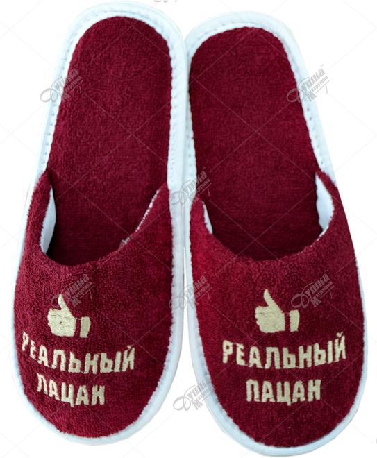 Тапочки с вышивкой «Реальный пацан». Ткань верха и следа - махровая ткань. Размер 42-43 длина по стельке 290 мм. Размер 44-45 длина по стельке 300 мм. Подошва ЭВА толщиной 4,5 мм. Обращаем внимание, что на данную категорию выпускаемой продукции даем гарантию только на изделие и вышивку. Цвета самих тапок и ниток могут меняться, идут в ассортименте. Теги: Тапочки, Мужские