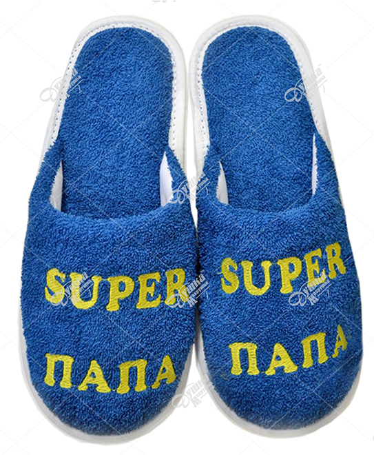 Тапочки с вышивкой "Супер папа". Ткань верха и следа - махровая ткань. Размер 42-43 длина по стельке 290 мм. Размер 44-45 длина по стельке 300 мм. Подошва ЭВА толщиной 4,5 мм. Обращаем внимание, что на данную категорию выпускаемой продукции даем гарантию только на изделие и вышивку. Цвета самих тапок и ниток могут меняться, идут в ассортименте. Теги: Тапочки, Мужские