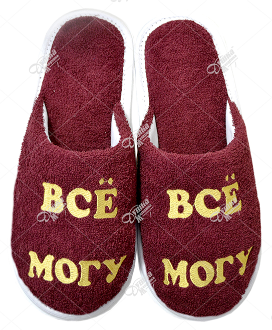 Тапочки с вышивкой "Все могу". Ткань верха и следа - махровая ткань. Размер 42-43 длина по стельке 290 мм. Размер 44-45 длина по стельке 300 мм. Подошва ЭВА толщиной 4,5 мм. Обращаем внимание, что на данную категорию выпускаемой продукции даем гарантию только на изделие и вышивку. Цвета самих тапок и ниток могут меняться, идут в ассортименте. Теги: Тапочки, Мужские