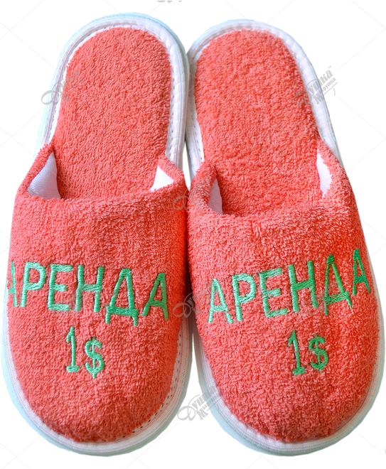 • Тапочки с вышивкой "Аренда 1$". Ткань верха и следа - махровая ткань. Подошва ЭВА толщиной 4,5 мм. Обращаем внимание, что на данную категорию выпускаемой продукции даем гарантию только на изделие и вышивку. Цвета самих тапок и ниток могут меняться, идут в ассортименте.