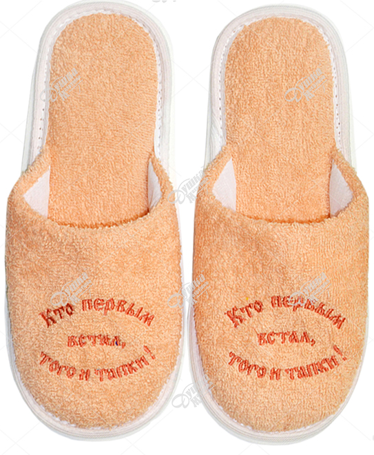Тапочки с вышивкой "Кто первый встал, того и тапки". Ткань верха и следа - махровая ткань. Подошва ЭВА толщиной 4,5 мм. Обращаем внимание, что на данную категорию выпускаемой продукции даем гарантию только на изделие и вышивку. Цвета самих тапок и ниток могут меняться, идут в ассортименте. Теги: Тапочки, Женские