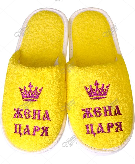 Тапочки с вышивкой "Жена царя". Ткань верха и следа - махровая ткань. Подошва ЭВА толщиной 4,5 мм. Обращаем внимание, что на данную категорию выпускаемой продукции даем гарантию только на изделие и вышивку. Цвета самих тапок и ниток могут меняться, идут в ассортименте. Теги: Тапочки, Женские