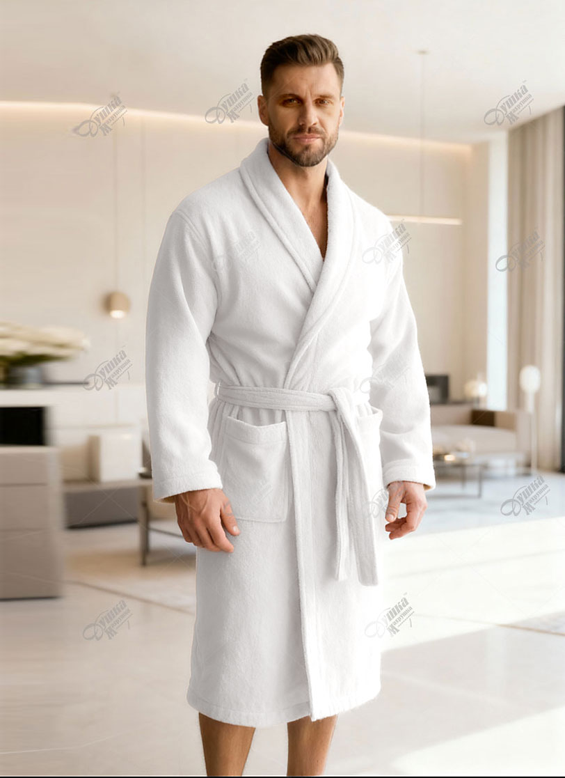 Удобный белый мужской халат с воротником «шалька» изготовлен из 100% хлопка. Плотность – 400 г/м². Мягкая махровая ткань хорошо впитывает влагу, гигроскопична, не линяет, отлично переносит многочисленные стирки. Шалька придает изделию солидный и респектабельный вид. Вместо пуговиц предусмотрен широкий пояс – это позволяет быстро и плотно запахнуть халат на теле. Отличный вариант для бань, саун, гостиничных комплексов, а также в качестве повседневной домашней одежды после водных процедур.